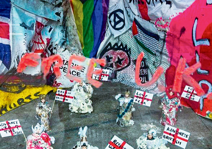 The Window Wonderland exhibition by the London Bomb Factory in Marylebone Road was vandalised repeatedly over Christmas, its director Pallas Citroen said. Union Jack and St George Cross stickers were placed on the windows with the words “Free UK” written in lipstick.