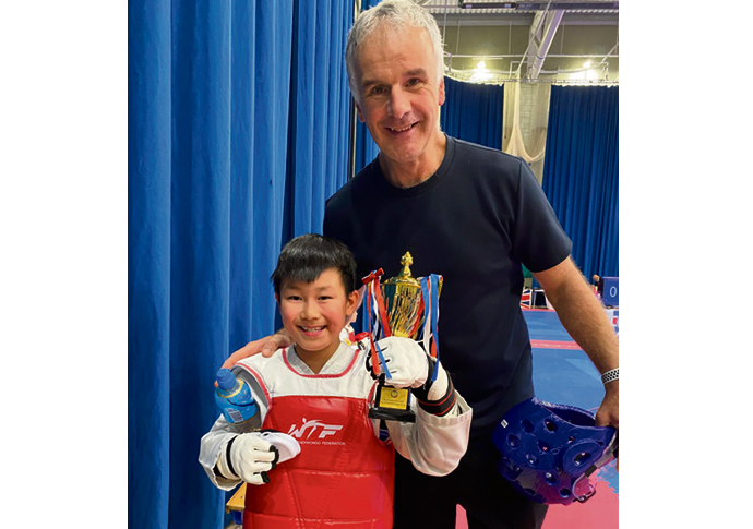 Eight-year-old Ekai Tan, pictured with Master Rienzi Trento, celebrates his gold in the sparring